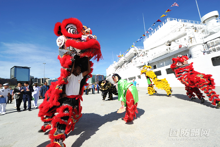 当地时间7月11日,在巴布亚新几内亚莫尔兹比港码头,当地民众舞动中国狮热情欢迎中国海军和平方舟医院船再次到访。江山 摄