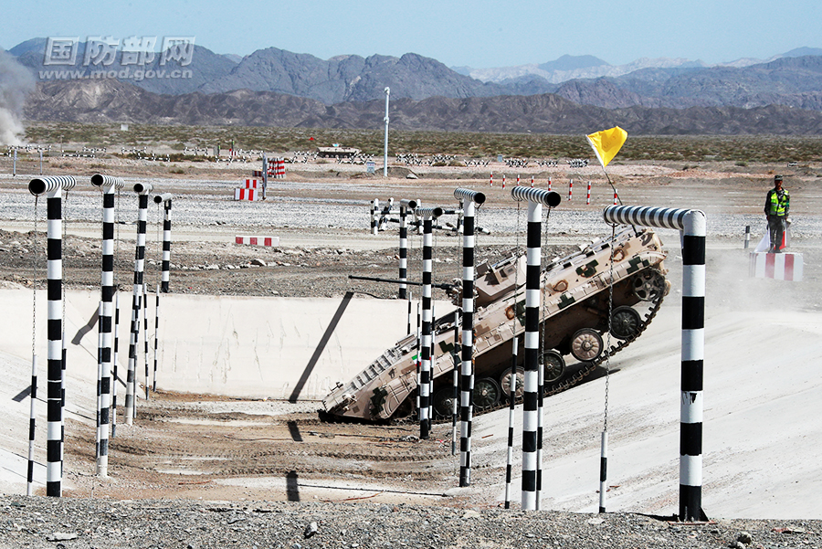 外军参赛车辆通过防坦克壕。袁凯 摄