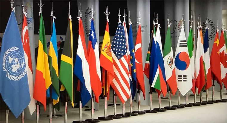△联合国旗和与会各国的国旗摆放在G20主会场迎宾处。
