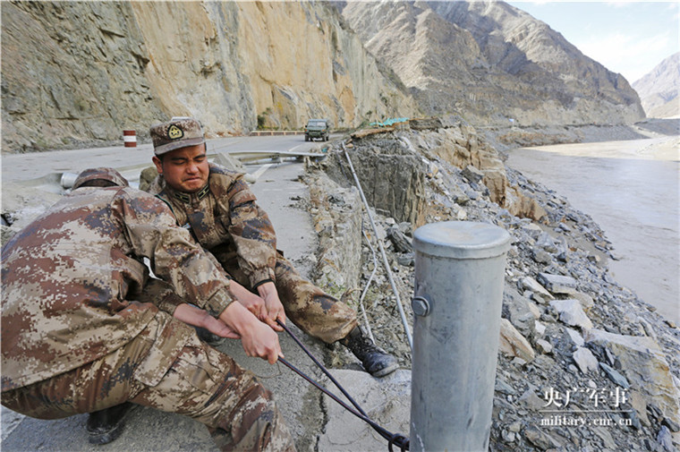 2018年11月,金沙江堰塞湖泄洪洪峰冲毁奔子栏镇部分路基,翁春芳和官兵紧急处理受影响的光缆。雎心阳 摄