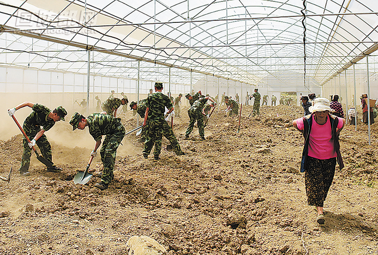 官兵帮助马尔康市丹波村群众建设蔬菜大棚。