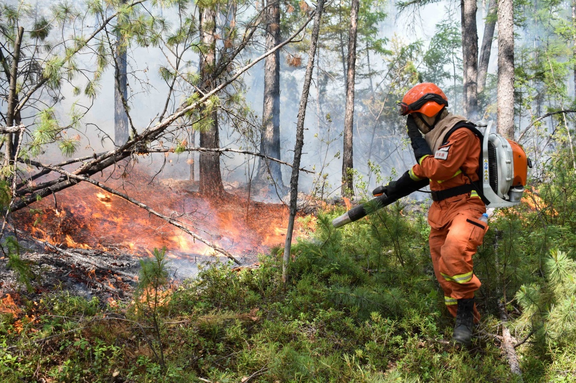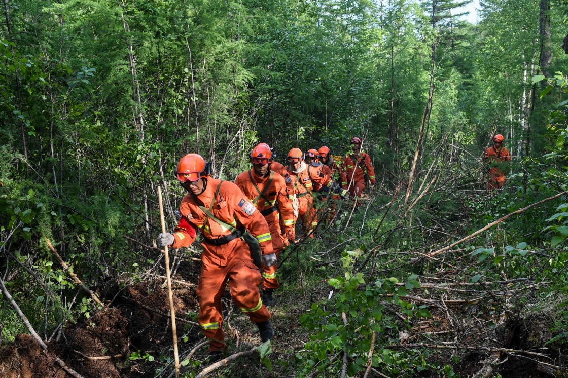 6月22日,呼伦贝尔市森林消防支队消防员在秀山林场火灾南线灭火。新华社发(胡首 摄)
