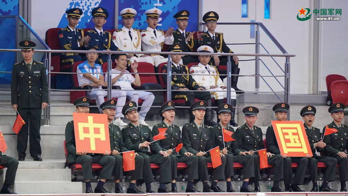 10月21日晚,第七届世界军人运动会乒乓球男团决赛在武汉市五环体育中心体育馆上演。观众席上的官兵为运动员加油助威。中国军网记者 柳军 摄